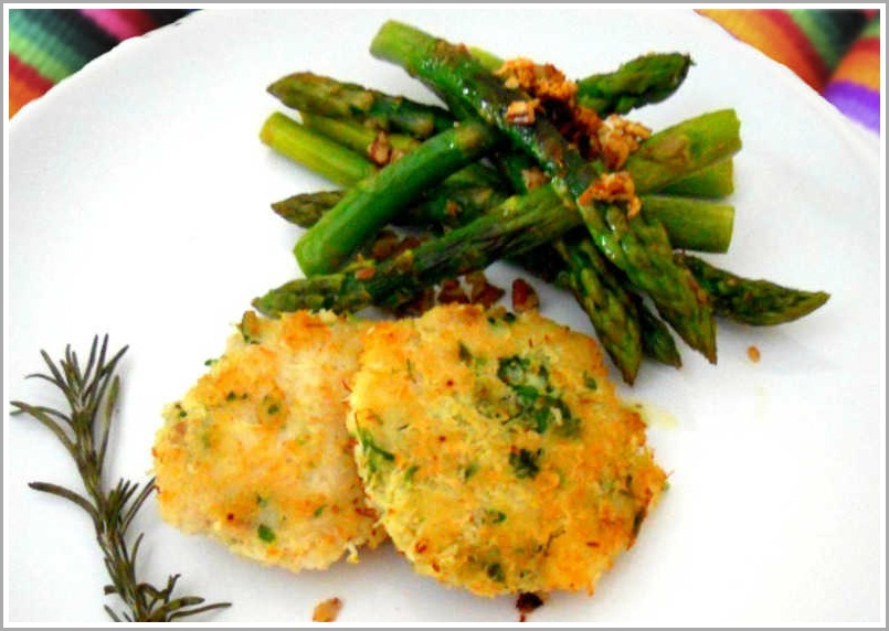 For the asparagus: Steam the asparagus for about 3 minutes. In a frying pan add the oil and garlic, when the garlic starts to change color, add the asparagus and sauté for a few minutes, add the pecans and season with salt.